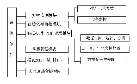 為了將系統(tǒng)集成為具有測(cè)量、控制、管理功能于一體的測(cè)控系統(tǒng),在車間級(jí)的Intranet中集成了生產(chǎn)在線數(shù)據(jù)庫(kù)以及控制參數(shù)與工藝數(shù)據(jù)庫(kù)服務(wù)器,生產(chǎn)在線數(shù)據(jù)庫(kù)服務(wù)器主要用于管理當(dāng)日當(dāng)班的人員、計(jì)劃調(diào)度以及生產(chǎn)完成情況,工藝數(shù)據(jù)庫(kù)服務(wù)器主要用于記錄生產(chǎn)工藝參數(shù)、重要工段以及重要設(shè)備的定時(shí)抽檢數(shù)據(jù)、故障幾率等,便于了生產(chǎn)管理。整個(gè)程序的設(shè)計(jì)功能如下: