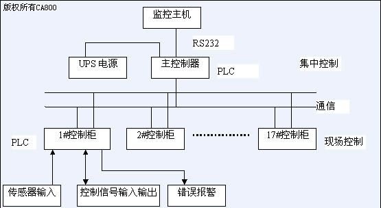 該攔河壩由17孔啟閉式閘門組成閘門 其跨度約為300m,閘門的最大開度可達1.7m。閘門控制房距離大壩迎水面40m。由于地理跨度較大,本閘門控制系統(tǒng)采用總線分布式分級控制方式進行設計。