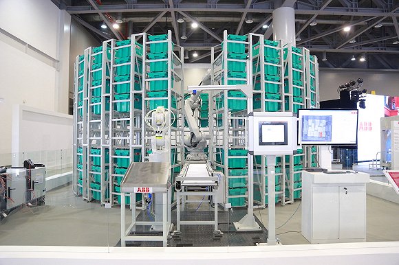 在本屆活動上,ABB也展出了關于物流倉儲的新型機器人——“小型機器人(IRB1200)+大型機器人(IRB6700)”的組合應用。大機器人負責從上層傳送帶提取料箱,按照指令存入貨架相應位置,小機器人借助3D視覺輔助,拾取箱中物品并放置在下道工序的傳送帶上。