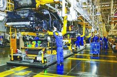位于江北新區的南汽浦口工廠總裝車間里,總裝生產線上,裝載著發動機的移動機器人全程跟隨生產線上的工人對車輛進行組裝。本報實習生董家訓本報記者崔曉攝